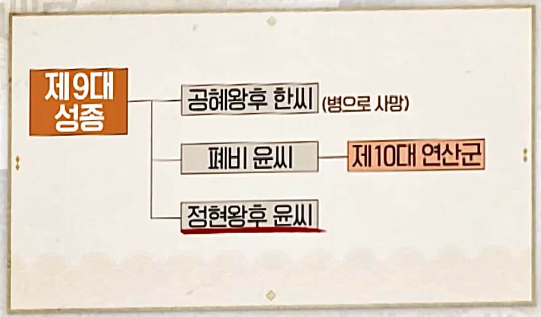 - 친어머니의 죽음 이후 폐비 윤씨에 이어 새 중전이 된 세 번째 왕비 정현왕후가 자신의 친엄마인 줄 알고 자란 연산군